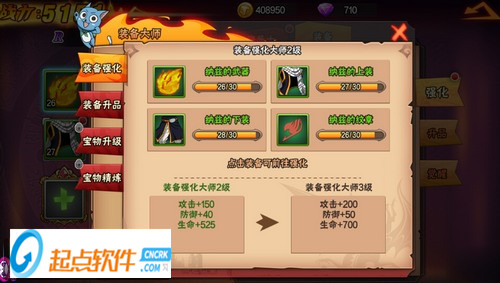 四種裝備類型分別對應不同的屬性加成,使用金幣能夠對裝備進行強化。其中強化武器能夠獲得更高的攻擊力加成、強化紋章能夠同時獲得生命與攻擊力加成、強化上裝能夠獲得防御力加成、強化下裝能夠獲得生命值加成。