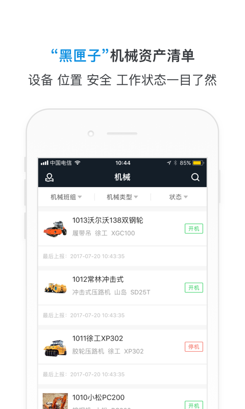 機(jī)械指揮官是國內(nèi)領(lǐng)先的工程機(jī)械智慧管理解決方案,涵蓋機(jī)械設(shè)備位置、安全、油耗、工作時(shí)間、施工效率分析,全方位提高施工企業(yè)的設(shè)備管理效率。機(jī)械指揮官是南京智鶴電子科技旗下,專注于工程機(jī)械管理的物聯(lián)網(wǎng)解決方案。從機(jī)械的使用、保養(yǎng)、維修、安全風(fēng)險(xiǎn)控制各環(huán)節(jié),將工作時(shí)間、地理位置的實(shí)時(shí)數(shù)據(jù)與企業(yè)運(yùn)營管理鏈接在一起,實(shí)現(xiàn)G7手機(jī)管車,通過工程機(jī)械Saas平臺(tái)構(gòu)建您的現(xiàn)代化信息管理系統(tǒng)。