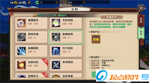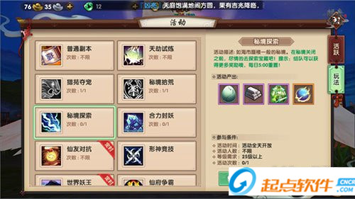 25級開啟,每天可進(jìn)入一次,探索點(diǎn)很多,消耗靈力進(jìn)行探索獲得很多道具。如果沒有靈力也別慌,進(jìn)入后,點(diǎn)擊NPC可以獲得40點(diǎn)靈力。組隊(duì)進(jìn)入后,隊(duì)友探索成功仙友都可以獲得獎(jiǎng)勵(lì)。