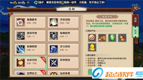 每天的固定時(shí)間段仙友可組隊(duì)進(jìn)入仙友對抗與其他玩家PK,每個(gè)隊(duì)員擁有固定的復(fù)活次數(shù),復(fù)活次數(shù)消耗干凈之后就不可以繼續(xù)參戰(zhàn)了。在仙友對抗中,比較考驗(yàn)隊(duì)伍戰(zhàn)斗力及配合度。