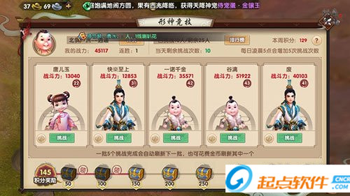 18級開啟,仙友首次可以挑戰(zhàn)其他仙友15次,每天凌晨五點(diǎn)增加五次挑戰(zhàn)次數(shù),每周固定可以挑戰(zhàn)25人。挑戰(zhàn)時(shí)建議優(yōu)先選擇戰(zhàn)斗力較低的玩家,可以使用金幣刷新高戰(zhàn)力對手。挑戰(zhàn)獲勝可以獲得積分,在挑戰(zhàn)前可以押分增加獲勝后獲得的積分?jǐn)?shù),壓分越高,對方戰(zhàn)斗力提升越高。達(dá)到一定分?jǐn)?shù)可以領(lǐng) 取該分?jǐn)?shù)段獎(jiǎng)勵(lì)寶箱,包括玄玉和星魄。