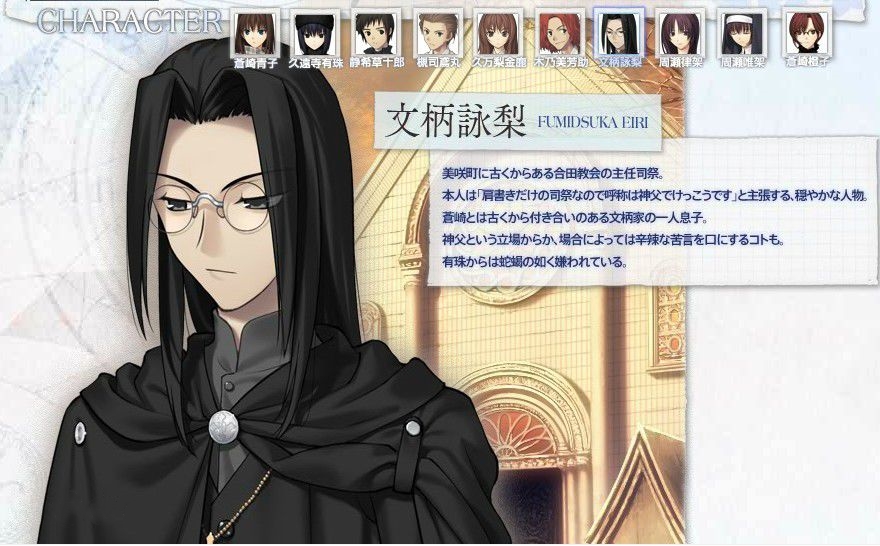 合田教會(huì)的主任牧師,身高1米91,性格沉穩(wěn),但偶爾也會(huì)以神父的身份毒舌一下。作為自古就與蒼崎家交往甚密的文柄家的獨(dú)生子,卻對(duì)有珠頗為忌憚。