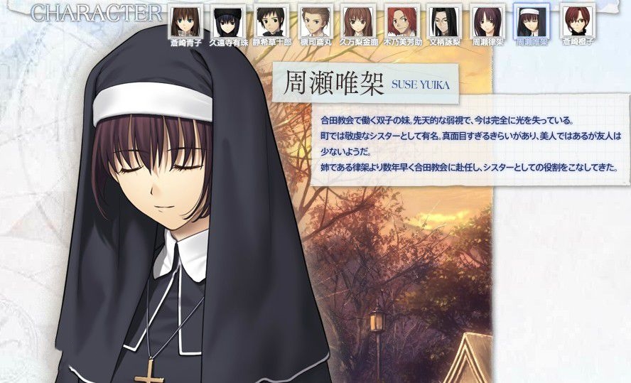 在合田教會(huì)工作的雙胞胎妹妹,患有先天性的弱視,已經(jīng)完全失明了。在鎮(zhèn)上是出了名的虔誠(chéng)的修女,性格有點(diǎn)認(rèn)真過(guò)頭。雖然是美人但貌似沒(méi)什么朋友。