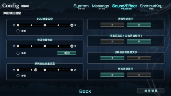 故事全篇在音效上采用了人頭錄音,在文字游戲中鮮少有公司使用這種錄音方式。此種音效是在錄制的時(shí)候采用了特殊的錄音方式,達(dá)到了雙聲道耳機(jī)也能體會(huì)7.1聲道效果的突破。缺點(diǎn)也是普通音響聽(tīng)不出效果,7.1聲道的音響。推薦耳機(jī)欣賞。順便一提,電影院都是7.1聲效,當(dāng)然硬件上也是配合7.1聲效的8聲道揚(yáng)聲器。