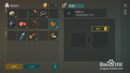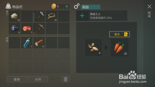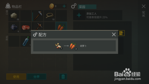 5.關(guān)于農(nóng)田本人做的測試:目前我的農(nóng)田上限為2塊(媽個雞為了測試不小心多造了兩個現(xiàn)在放不下去了心疼..(???ε???)),以一塊放一個種子,一塊放二個種子測試,最后結(jié)果顯示2個種子產(chǎn)出的蘿卜是1個種子的整兩倍,放入種子后顯示的時間是一個種子完成生長的時間,所以建議農(nóng)田可以按能造的最大數(shù)目建造,平均放入種子以獲得最大利用率