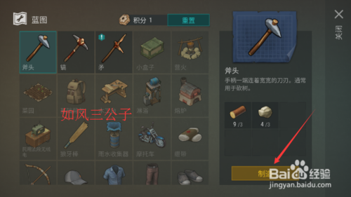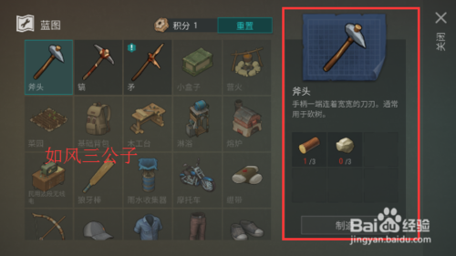 在地球末日手游游戲的藍(lán)圖頁面中,我們可以了解到制作斧頭需要的材料分別是3跟木材以及1塊石頭。