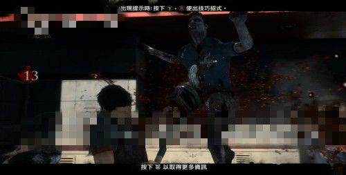 玩家一開(kāi)始可以攜帶4件物品,一路上的回復(fù)品和武器都很充足,不要擔(dān)心用完。繼續(xù)向前走時(shí)路又會(huì)被堵住,這時(shí)候撿起一件武器,按Y使用重攻擊,即可將門(mén)打破,來(lái)到新區(qū)域會(huì)觸發(fā)劇情,之后玩家可以快速的一路奔跑避開(kāi)喪尸。需要說(shuō)明的是,這里的流程比較死板,所以一路上按照提示就能逃到外面,到達(dá)新區(qū)域觸發(fā)新劇情。
