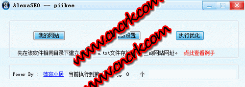 使用方法:點(diǎn)擊我的網(wǎng)站按鈕,加入你所要優(yōu)化的網(wǎng)站,點(diǎn)擊參數(shù)按鈕,設(shè)置優(yōu)化遍數(shù)和超時(shí)時(shí)間等參數(shù)。最后點(diǎn)擊執(zhí)行優(yōu)化即可實(shí)現(xiàn)alexa優(yōu)化了。data.txt文件中已經(jīng)存放了一些查詢網(wǎng)站網(wǎng)址,如果還要增加ALEXA排名查詢網(wǎng)站的網(wǎng)址,可以在data.txt文件中加入。加入的URL參考例子。