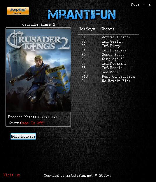 十字軍之王2十項修改器是專為《十字軍之王2》游戲玩家們所準備的游戲修改工具。該工具可為玩家提供無限財富、無限虔誠、無限聲望等等十項游戲修改功能,有需的玩家自取。