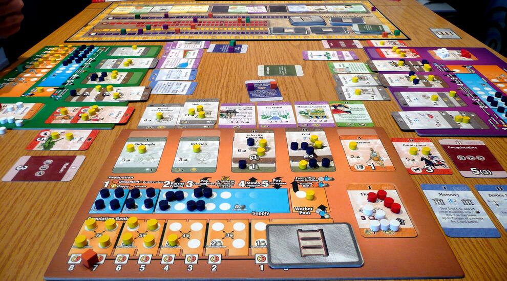 歷史巨輪將文明的各種元素簡(jiǎn)化、整合了起來,玩家要在3個(gè)時(shí)代接近20回合的角逐中,招募偉人、建造奇跡、發(fā)展基建、訓(xùn)練部隊(duì)、開拓殖民,時(shí)刻關(guān)注自己的科技、文化、農(nóng)業(yè)、工業(yè)、政體、軍事、幸福度等指標(biāo),迎接一系列未來的不確定性事件,時(shí)刻準(zhǔn)備發(fā)起戰(zhàn)爭(zhēng)或抗戰(zhàn)。多人局還要兼顧外交關(guān)系,簽署外交協(xié)議。大家還記得和《文明》類似的桌游《歷史巨輪》(Through the Ages)嗎?