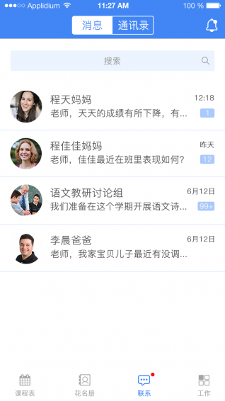 3、即時(shí)聊天。方便老師們互相溝通,也可以和自己任教班級(jí)的家長隨時(shí)溝通,隨時(shí)了解學(xué)生們的情況;