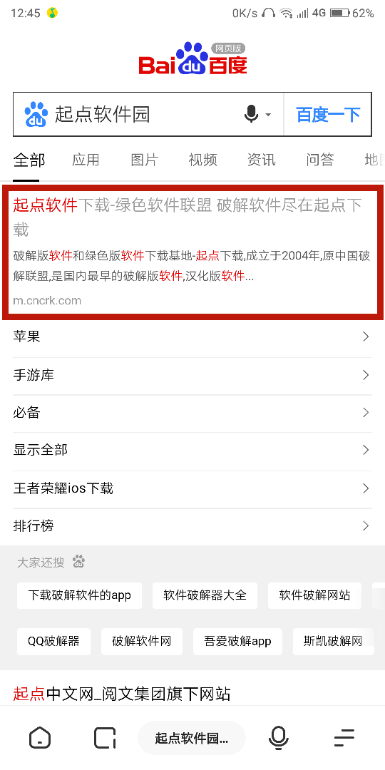 1.打開(kāi)手機(jī)瀏覽器,百度搜索起點(diǎn)軟件園