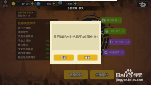 資源共分為:進(jìn)化孢子(綠),強(qiáng)化孢子(紅),神性孢子(黃),食物,同化經(jīng)驗,以及挑戰(zhàn)基因獸永久增加全隊屬性的機(jī)會。