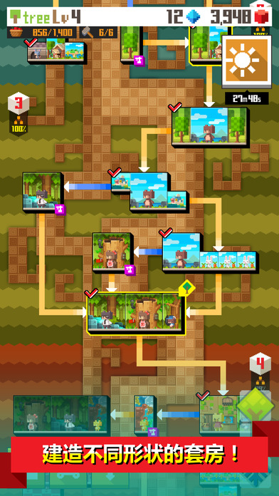 搖晃樹收集水果和金錢。從樹根地圖找到隱藏圖紙為居民們修建更多住所。