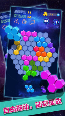 去除了俄羅斯方塊和1010中文版的限制后,六邊形消消樂的橫、左斜、右斜都可消除,方式更自由。友情提示:規(guī)則和1010中文版類似,放置有分、六角消除有分、多行消除得分更高哦。