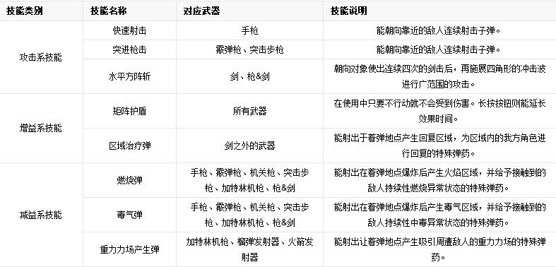 玩家可借由使用SP(技能點(diǎn)數(shù))來取得技能。另外還存在為了取得技能所要求的基本能力。每種武器皆可設(shè)定技能,除共通技能外,也存在著固有技能。
