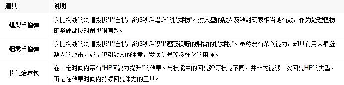 游戲中存在著工具用的控制面板,最多能設(shè)定至4種為止,并能攜帶至戰(zhàn)斗中。不僅是手榴彈及地雷,還存在著投擲小刀或回復(fù)包等各種不同種類的工具。越為強(qiáng)力的工具,則越要求DEX等基本能力值。