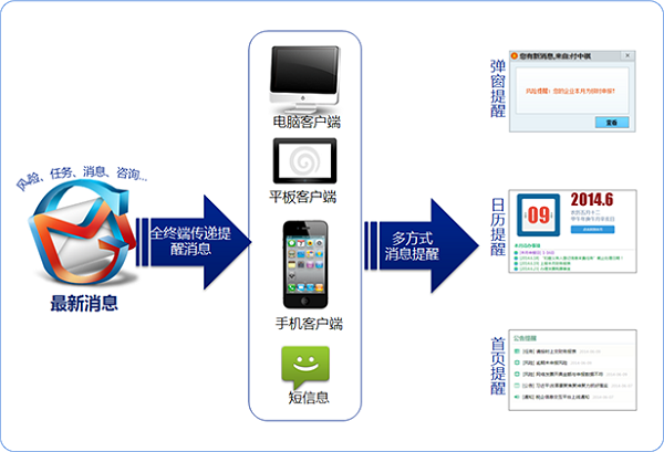 提供便捷、多渠道的即時消息提醒服務(wù),自動實時將與用戶相關(guān)的涉稅風險、涉稅任務(wù)、申報期限、通知公告、涉稅政策等信息到達、快到處理期限進行電腦彈窗、手機通知中心、平板消息中心、辦稅日歷、短信息等多方式提醒。 對用戶而言,消息提醒多渠道、多方式的傳遞,用戶不用擔心錯過任何重要消息,實現(xiàn)由“人找人”向“信息找人”的轉(zhuǎn)變!