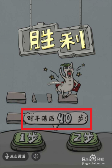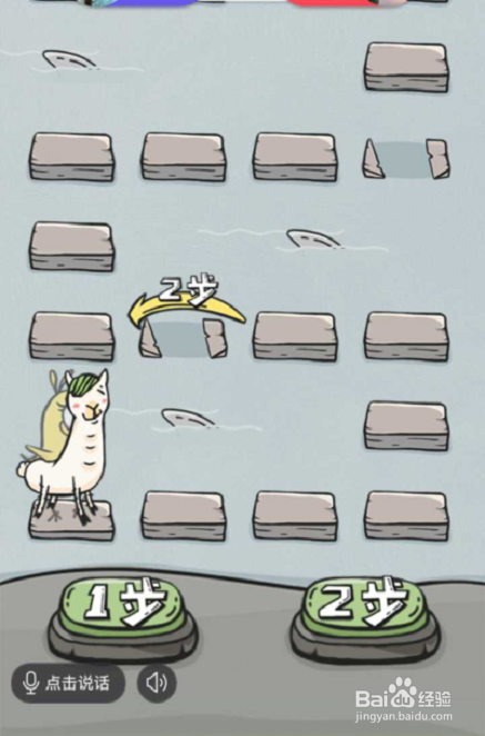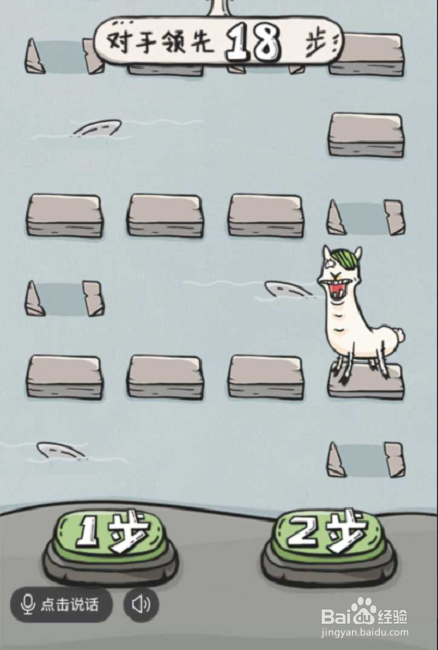 我們可以看到分別為:“一步”、“兩步”的綠鈕,那么應(yīng)該怎么取擇呢,當(dāng)選一步時向前蹦一個石塊,二步則蹦兩下,這是基礎(chǔ)的規(guī)定。要知道,速度也就必備的,開局直接點六下“2步”,根本不會落坑。