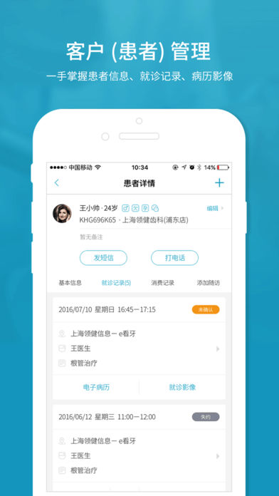 e看牙是一款專為口腔醫(yī)生量身打造的移動辦公應用,是醫(yī)生的“移動診室”。幫助醫(yī)生完成工作日程管理、患者管理、診后隨訪、醫(yī)患交流、病歷維護等,支持與診所前臺、診所老板、診所其他醫(yī)生等角色協(xié)作辦公,并且移動端數(shù)據(jù)與PC端診所云管理系統(tǒng)實時同步。此外,e看牙平臺還會通過多種渠道為診所輸送客戶,真正做到開源節(jié)流。【功能介紹】