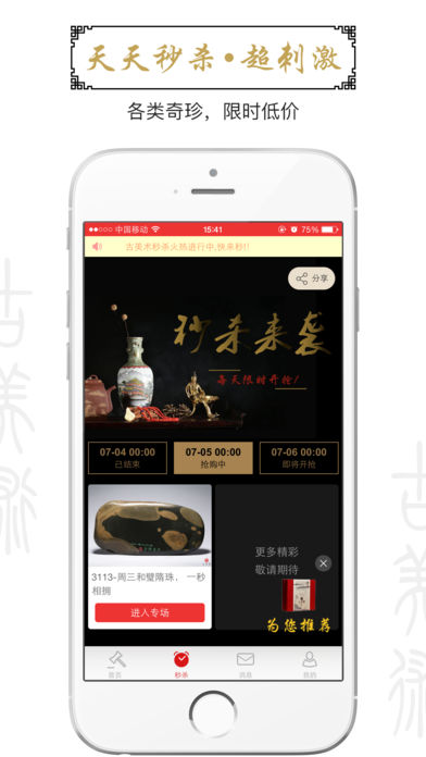 1. 交易專場:每日上線多個專場、各類產品供您選擇,提供加一手、委托出價等便捷競價方式;2. 頁面分類:可查看各類專場、產品競價情形,支持即時競拍、開拍提醒和商品預拍;