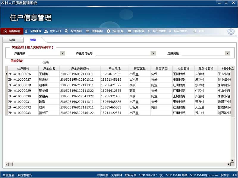 《農(nóng)村人口房屋管理系統(tǒng)》是按照網(wǎng)格化管理的要求,通過現(xiàn)代的科技手段,對轄區(qū)住戶、人口信息等進(jìn)行全方位管理。本軟件適用范圍:鄉(xiāng)鎮(zhèn)、村委會、派出所等。簡單易用、智能高效是軟件的特點!用戶無需復(fù)雜的操作、甚至可以很少打字,只需指指點點就可以高效快速的完成復(fù)雜的管理工作。信息采集除非必須鍵盤輸入,全部實現(xiàn)智能導(dǎo)入、鼠標(biāo)點選錄入,最大程度的提高了工作效率。