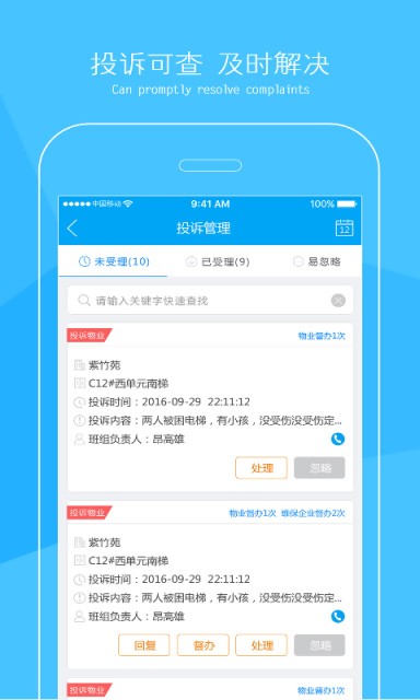 1.投訴管理:打通業(yè)主與物業(yè)/維保企業(yè)的溝通橋梁,及時有效解決問題。