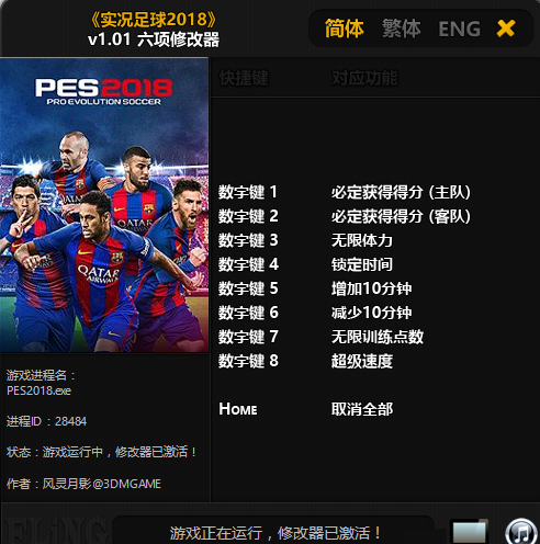 實(shí)況足球2018六項(xiàng)修改器,擁有無(wú)限體力、無(wú)限訓(xùn)練點(diǎn)數(shù)、鎖定時(shí)間、超級(jí)速度、直接得分、增加10分鐘、減少10分鐘等功能,實(shí)況足球2018修改器v1.01由“風(fēng)靈月影”制作,喜歡的玩家不要錯(cuò)過(guò)哦!【軟件特點(diǎn)】