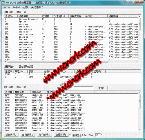My Love 進程管理工具RING3權(quán)限無驅(qū)動最高,用于管理進程、終止進程、終止線程、注銷模塊等功能。