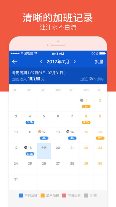 安心記加班,最省心實用小工具,一鍵記錄加班時間,準確快速統(tǒng)計上班工資,隨時查看,讓上班、加班,記工時,算工資,考勤,記錄計算變得根本不是事兒。即使公司沒有工資單,從此也不再需要紙,筆,記事本,計算器,不用到發(fā)工資時一次次跑去HR補工時,不用擔心公司,工廠,老板少發(fā)工資。