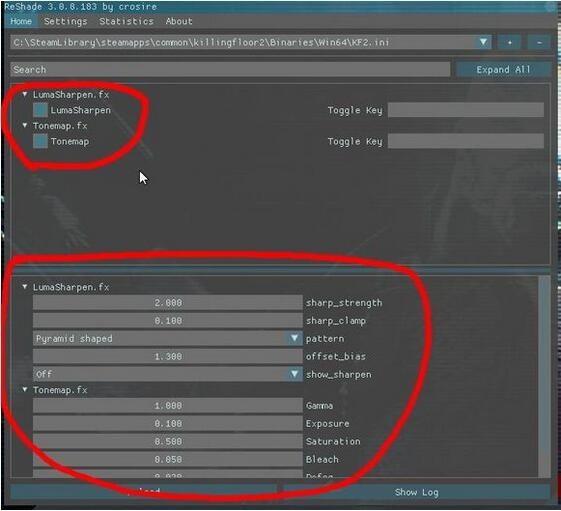 下拉并選擇KF2.ini,LumaSharpen和Tonemap前面的方框可開啟或關(guān)閉特效,窗口下方還可以設(shè)置參數(shù)進(jìn)行微調(diào)