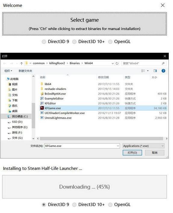 運(yùn)行ReShade_Setup_3.0.8.exe, selete game ,選擇 kfgame.exe,勾選 direct 10+模式,接著彈出一個窗口,選擇”是“,下載完畢后,僅勾選LumaSharpen.fx 和 Tonemap.fx ,點(diǎn)OK,安裝完畢。