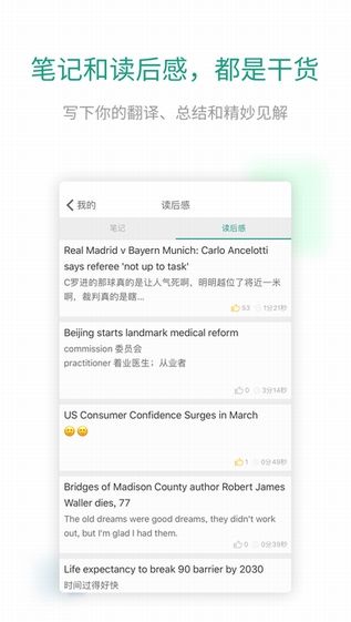 如果你不相信自己居然有一天可以通讀完一本英語名著,那么扇貝閱讀會改變你的想法,讓你發(fā)現(xiàn)自己原來可以做到很多。通過扇貝閱讀,你既能夠將所學單詞加以使用,擴展新知,又能通過閱讀進一步積累詞匯,看到更大的世界。短文的每一段都可以自由添加讀書筆記,你的優(yōu)質(zhì)讀書筆記還會獲得其他用戶的點贊;閱讀完一篇文章,在讀后感區(qū)可以發(fā)布自己的評論,交流學習心得。