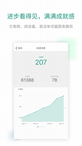 4. 你每天的學習進度,包括完成的文章數(shù),被激活的單詞數(shù)(即學過的單詞有多少出現(xiàn)在文中),都會通過圖表生動展示。