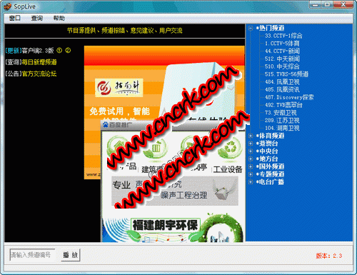 SopLive網(wǎng)絡(luò)電視是一款全新P2P網(wǎng)絡(luò)電視聚合軟件,適用于所有Windows系統(tǒng),用戶使用這款軟件可以免費(fèi)收看上千套電視直播,和精彩體育賽事直播,每個(gè)頻道有多個(gè)線路供網(wǎng)友選擇。SopLive根據(jù)網(wǎng)友要求,不斷完善補(bǔ)充,目前SopLive已是網(wǎng)上電視頻道最多的免費(fèi)網(wǎng)絡(luò)電視,包括《熱門頻道》《體育頻道》《中央臺(tái)》《國內(nèi)電視臺(tái)》《港澳臺(tái)》《國外電視臺(tái)》《專題頻道》《在線廣播》八大模塊。