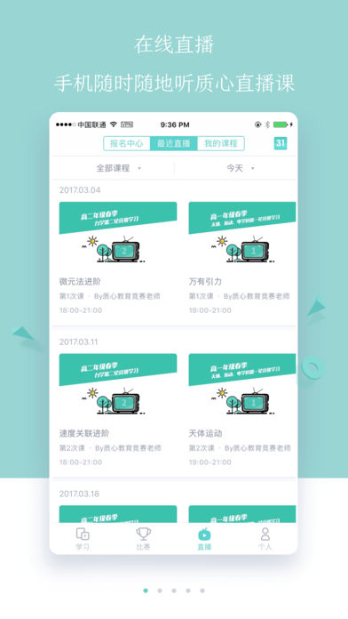 電腦、手機(jī)任意地點(diǎn)觀看質(zhì)心大神們直播講解競(jìng)賽課程,疑難問(wèn)題,實(shí)驗(yàn)操作。在直播課堂上,可以看到教師準(zhǔn)備的課程大綱,可以隨時(shí)進(jìn)行提問(wèn),并和其它物競(jìng)學(xué)員互動(dòng)。每堂直播課都會(huì)全程錄制,參加直播課的學(xué)員可以隨時(shí)在網(wǎng)站 上回看課程,方便學(xué)員解決疑難,鞏固所學(xué)。