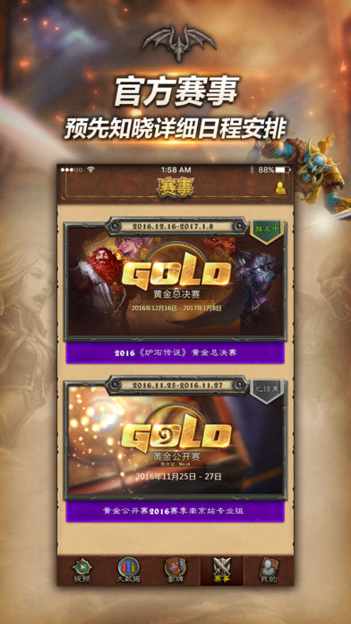 各大電競(jìng)賽事一直以來都備受爐石愛好者的關(guān)注,一場(chǎng)精彩的對(duì)決能給人帶來不小的樂趣和收獲。現(xiàn)在,你也可以通過隨身APP訂閱官方賽事日程、查看直播視頻,真正做到隨時(shí)隨地掌握第一手的賽事資訊。