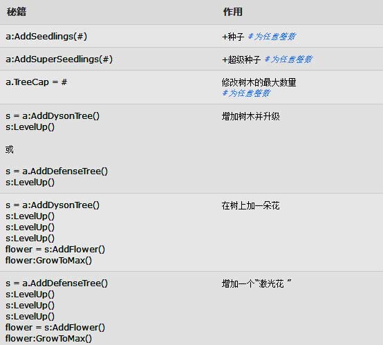 s=a:AddDysonTree()增加樹木并升級