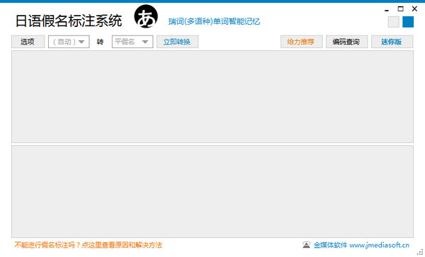 日語丸日語假名標(biāo)注系統(tǒng)是一款專業(yè)技術(shù)打造的專用于日語漢字的假名標(biāo)注工具,可以通過該系統(tǒng)實(shí)現(xiàn)日語漢字、平假名、片假名羅馬音之間的相互轉(zhuǎn)換,包括日語漢字轉(zhuǎn)換成平假名、片假名或羅馬音;平假名轉(zhuǎn)換成片假名或羅馬音;片假名轉(zhuǎn)換成平假名或羅馬音;羅馬音轉(zhuǎn)換成平假名或片假名等。