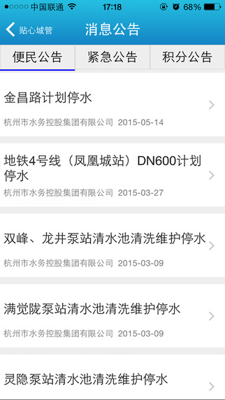 通過“消息公告”應用,為市民提供“便民公告”、“緊急公告”、“積分公告”等公告類信息服務,如停水、停電,積分活動等信息。