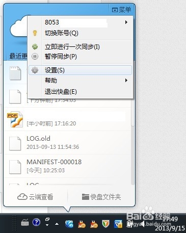 在金山快盤(pán)上右鍵,點(diǎn)擊【菜單】-->【設(shè)置】進(jìn)入金山快盤(pán)的設(shè)置界面。