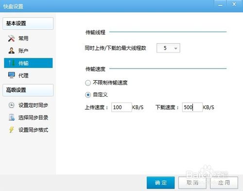 傳輸速度中,選擇“自定義”,這里分上傳速度和下載速度,上傳速度對(duì)網(wǎng)絡(luò)的影響是很大的,當(dāng)上傳占滿了帶寬的時(shí)候,打開(kāi)網(wǎng)頁(yè)時(shí)頁(yè)面會(huì)加載不了,這個(gè)值建議設(shè)置為你的帶寬的1/3,這樣不會(huì)影響自己和別人的上網(wǎng)。