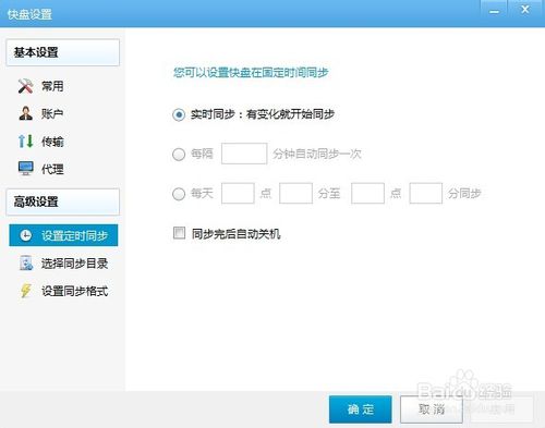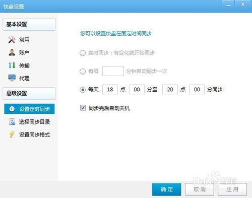 在快盤(pán)設(shè)置界面,點(diǎn)擊【設(shè)置定時(shí)同步】??梢赃x擇同步的間隔,也可以設(shè)置定時(shí)同步,如筆者在公司使用快盤(pán),所以會(huì)把同步的時(shí)候設(shè)置在下班時(shí)間,并且把“同步完成后自動(dòng)關(guān)機(jī)”這個(gè)選項(xiàng)選擇。這樣一方面不占用上班時(shí)間的帶寬,
