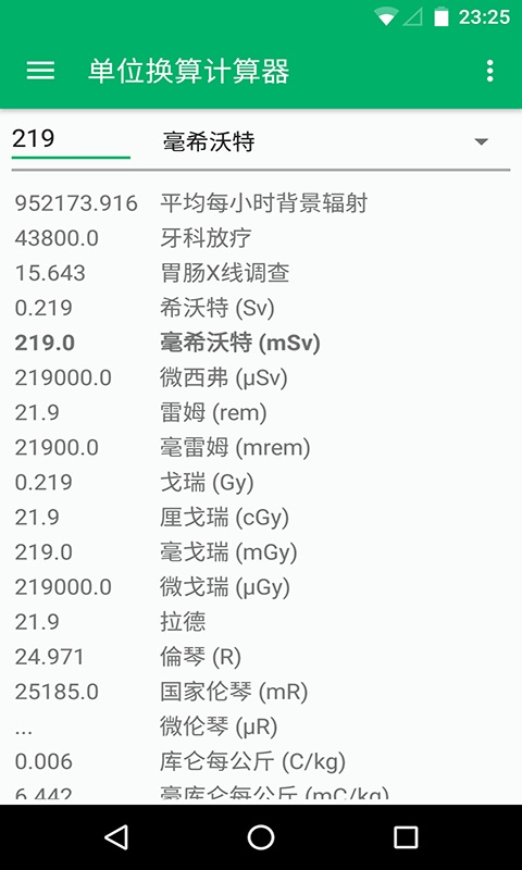多樣計量單位換算類別包括: 長度:寸,腳,碼,不同英里,公里,米,鏈,桿等等 速度:公里時,英里,英尺/秒,米/秒等等 重量:磅,盎司,公斤,各種噸,格令等等 面積:平方英寸,平方英尺,平方公里,英畝,公頃等等 體積:立方英尺、加侖、升、立方米,品脫等等 烹飪:各種勺子,盎司,品脫,斗等等 另外許多其他類別的量度單位準備進行轉換:力,時間,壓力,輻射,溫度,燃料消耗,功率,數(shù)字記憶,烹飪,角度