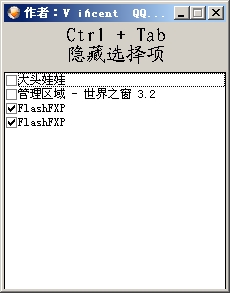 隱藏窗口小工具使用Ctrl+Tab快捷鍵隱藏/顯示選定的窗口(連同隱藏/顯示自身)。 F5 刷新窗口列表 F6 全選窗口 F7 取消選擇