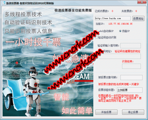 程序采用獨(dú)特穩(wěn)定的多線程技術(shù),偽造IP功能可突破大部分投票系統(tǒng)的IP限制.使用偽造IP經(jīng)測(cè)試每分鐘可高達(dá)42票.