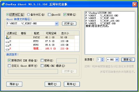 3、重新打開onekey ghost軟件,找到要還原的文件,選擇要還原安裝的分區(qū)。此時確定已經(jīng)可用,點擊確定即可。