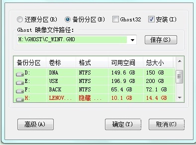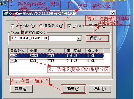 3、這為重要的一步,請認(rèn)真選擇。首先要選中備份分區(qū)也就是圖中的第一步,其次就要選中需要備份的系統(tǒng)分區(qū),然后就要選擇備份系統(tǒng)所要存放的路徑,默認(rèn)為最后一個分區(qū),也可點擊保存選擇備份到其他分區(qū),最后點擊確定