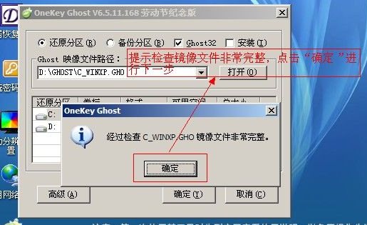 2、這步為還原系統(tǒng)重要的一步,請認(rèn)真選擇。首先選擇備份文件所在的分區(qū),一般默認(rèn)在最后一個分區(qū),是一個Ghost文件(提示:點擊“打開”可選擇備份文件所在的其他分區(qū))。其次選中備份文件要還原到的分區(qū),一般默認(rèn)到第一個分區(qū),大部分是C盤。這兩步選擇好之后點擊“確定”