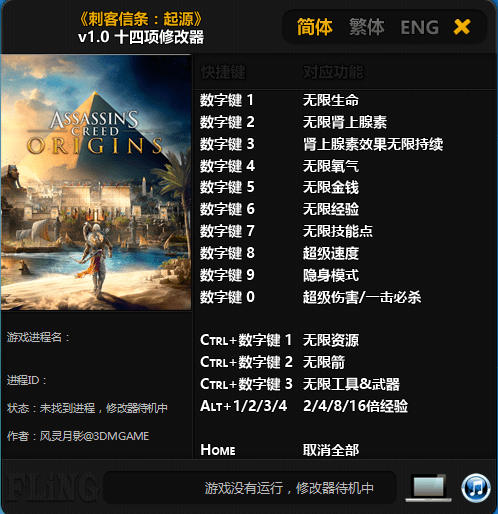 刺客信條起源3DM修改器是一款由“風(fēng)靈月影”制作分享的同名游戲修改器,本款刺客信條起源修改器可以隨意修改玩家游戲中的角色屬性,讓玩家輕而易舉的就能通過劇情任務(wù)。